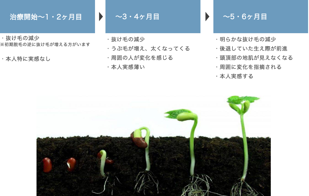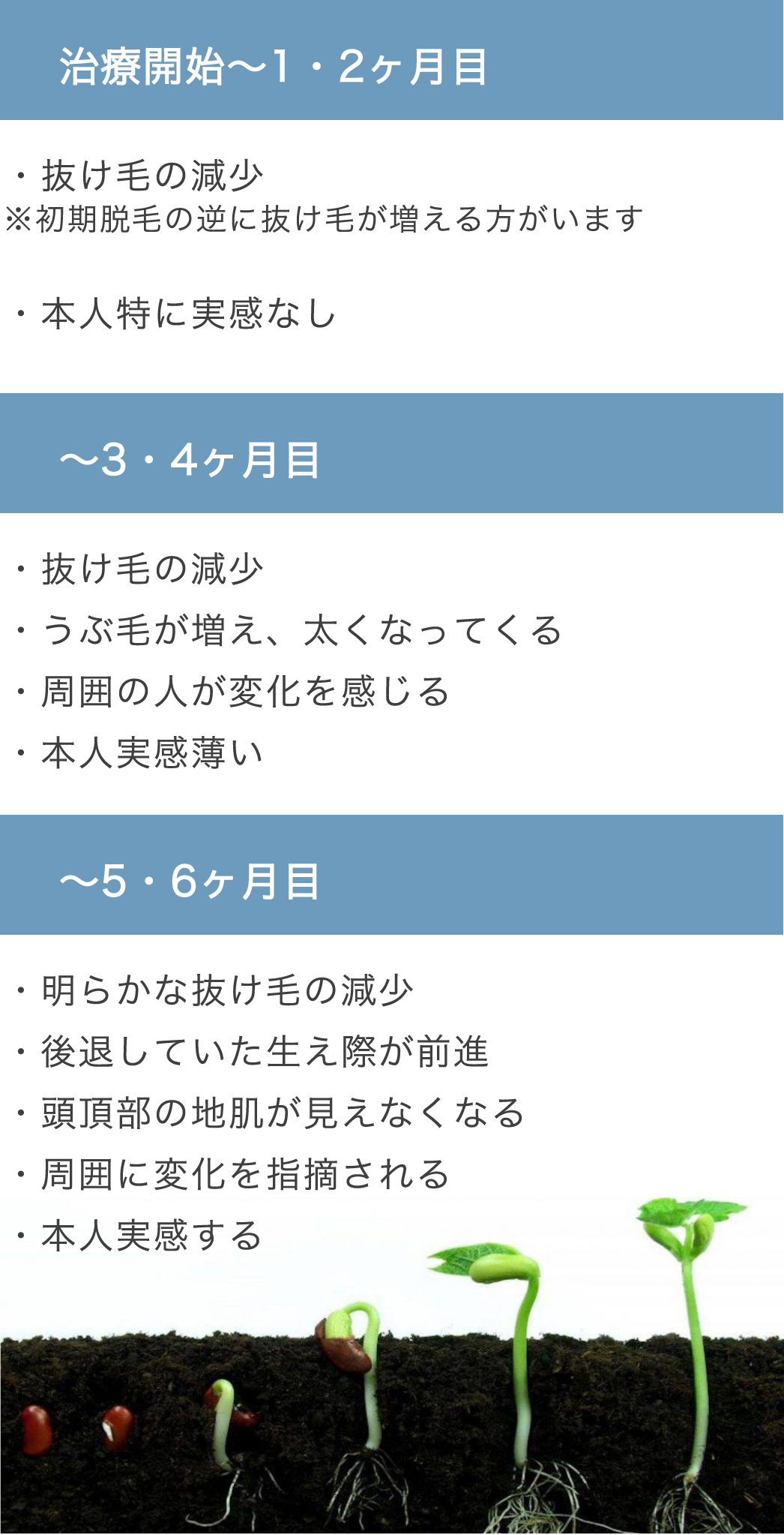 A.効果がでるまでは約4~5ヶ月かかることが多いです。もちろん発毛治療開始時の頭皮・頭髪の状態、選択した治療法、個人差などにより、それよりも早い場合もあれば遅い場合もあります。