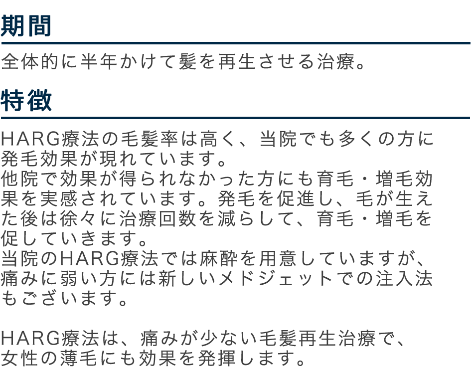 | HARG療法 | 頭皮の1/3の範囲 頭皮の2/3の範囲 頭皮の3/3の範囲 |